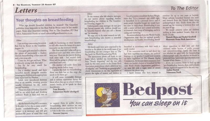 Becks check out last night's paper, letters to the Editor section. Everyone's having a go at that lady at the "great big latch on" (or whatever it was called) day, her pic was in the paper with a 2yo on one side and a 4yo on the other side (don't get me started on that  )