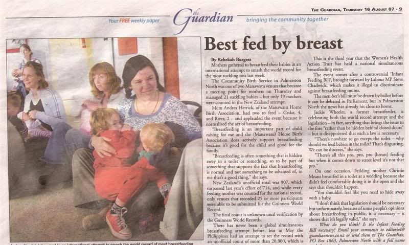 There has been some debate in our local paper about whether the new breastfeeding bill is or isn't necessary. For me, I've never had a problem with people "sticking their nose in" as it were (only about how many kids I have  ). What about you? Is this an Auckland thing? Or perhaps I hang around more family-friendly places now that I have 3 preschoolers? Open to discussion.....