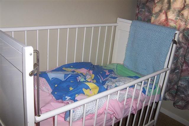 Here's Krystiana's cot, it's a bit rumpled because I had just got her up and was then limited to one hand. She has an underblanket, a top and bottom sheet (I only use the top now that she isn't wrapped though), a duvet (actually it's two summer duvets into one cover), and a woolen blanket for nights.