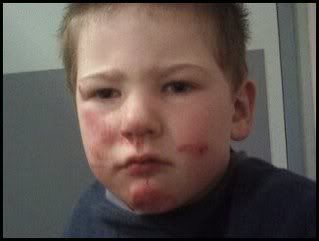 Now his face is covered with grazes and is fairly bruised. He will have a good black eye and both his lips are going to be a bit fat for a while.