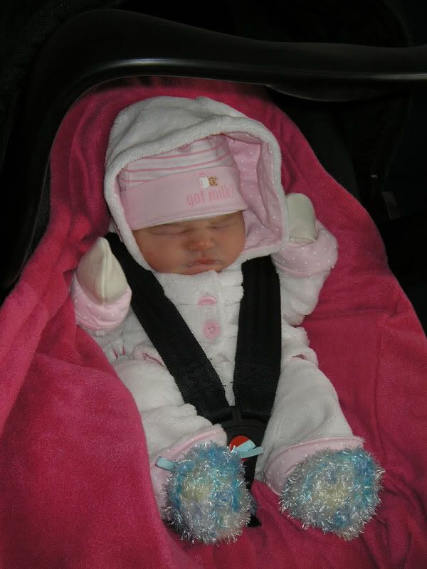 I love the fluffy booties and the little mittens and hat she has on in her carseat pic! so cute..
