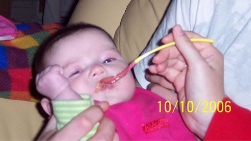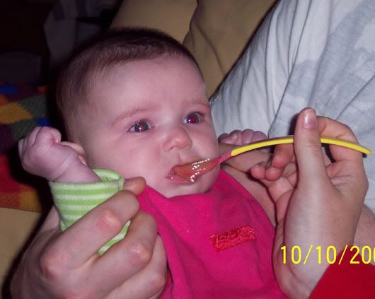 ohh looks like she,s taking the pears quite well jess james never liked his solids i had to leave town for a friend to get him to take then lol